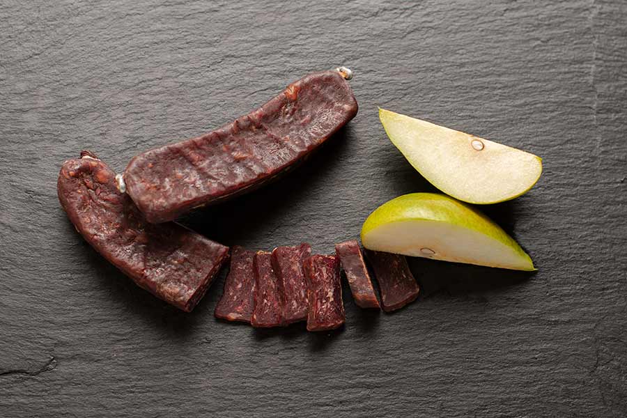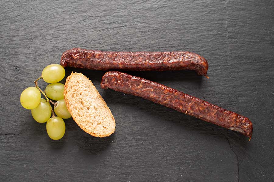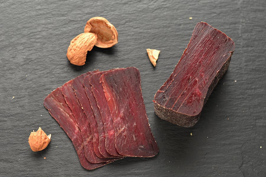 Das Trockenfleisch stammt von unseren eigenen Kühen, die bis zu 17 Jahre alt werden. Roman Hassler von der Dorfmetzgerei Malans veredelt uns das Fleisch schonend und nach traditioneller Art. Hierzu verwendet er unseren Biowein und ausschliesslich Biokräuter und -gewürze. Die Produkte werden mit echtem Holz geräuchert oder in der frischen Bergluft naturgetrocknet.